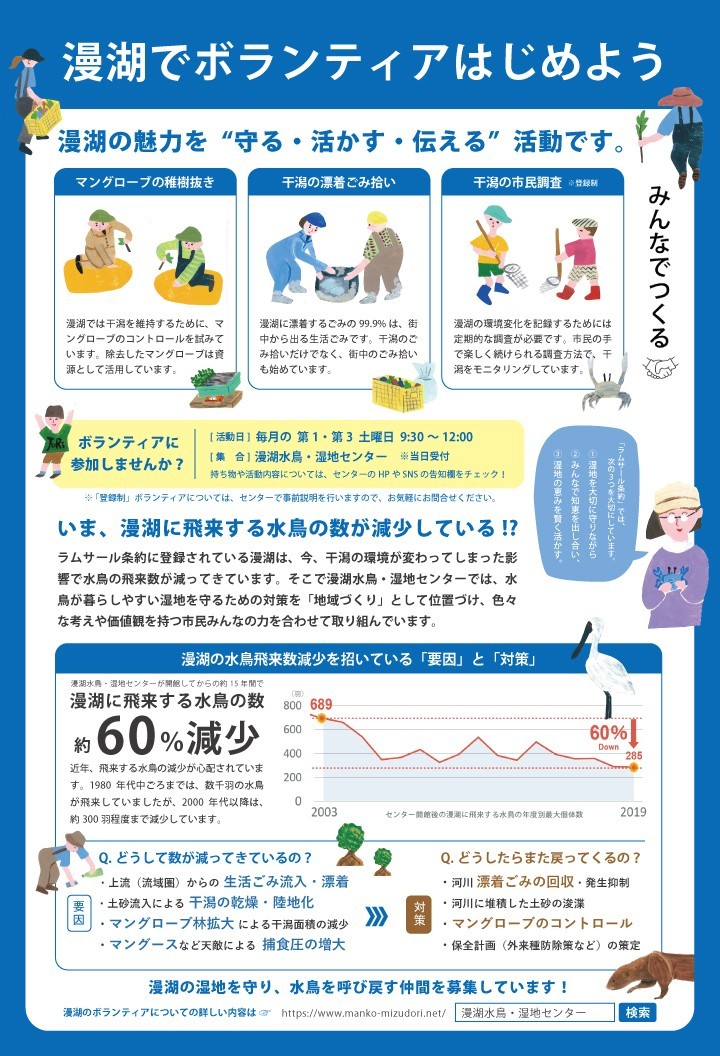 漫湖水鳥・湿地センターではボランティアを募集しています。ボランティアの皆さんには、漫湖の自然環境の普及啓発や調査、イベントなどの補助を通して、市民の皆さんに漫湖についての知識や関心を深めてもらえたらと考えています。